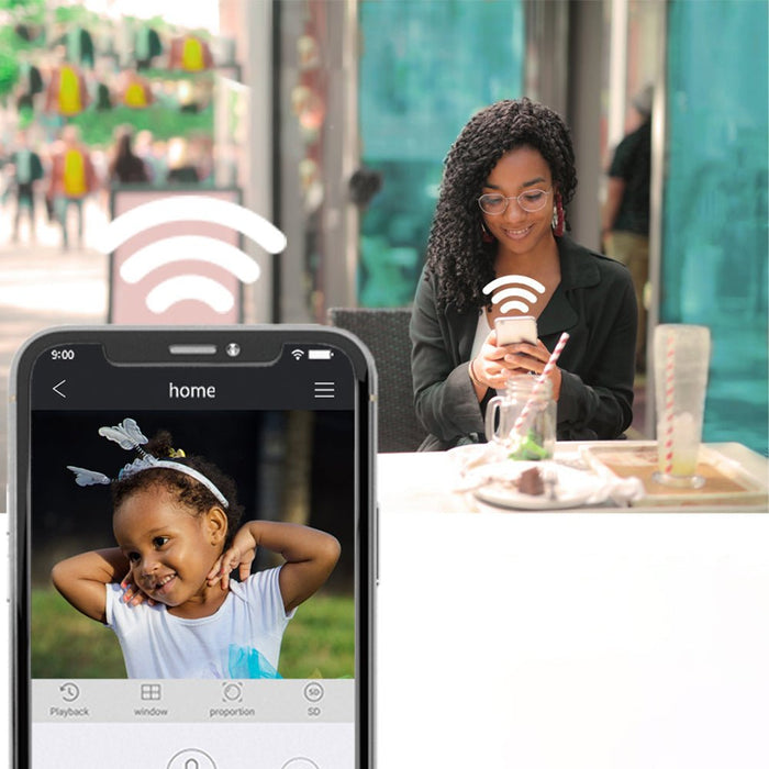 Mantenga conversaciones de audio en tiempo real con cualquier persona frente a la cámara a través de la APLICACIÓN, gracias a la compatibilidad con WiFi 2.4G incorporada (no se admite WiFi 5G). Almacene de forma segura las imágenes de su cámara con soporte para micro SD de hasta 128 GB (no incluida con la cámara).
