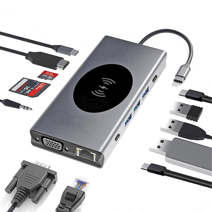 Pobod Estación de Acoplamiento Tipo C 13 en 1 - USB3.0, USB-C PD, HDMI, VGA, RJ45, Lector de Tarjetas SD/Micro SD, Audio de 3,5 mm, Cargador de teléfono inalámbrico - Ideal para teléfonos, televisores, tabletas, y portátiles
