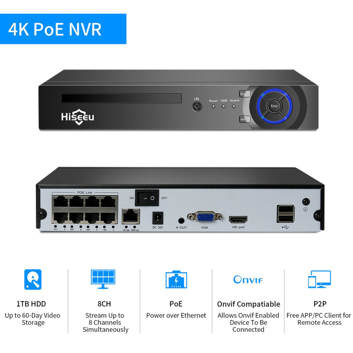 Hiseeu 8CH 5MP NVR-camerasysteem - 4 stuks POE H.265+ IP-beveiligingscamera's, audio, nachtzicht 10m, IP66 waterdicht, Onvif - Ideaal voor thuis- en zakelijke beveiliging