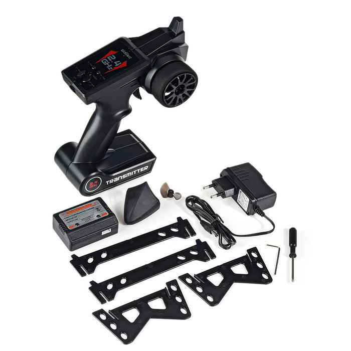 Neem de volledige controle over met de 2.4G-afstandsbediening van modelkwaliteit, die een indrukwekkende afstand van 120-150 meter biedt. De zender heeft 3x AA-batterijen nodig (niet meegeleverd) en is voorzien van automatische giercorrectie om nauwkeurig sturen en hanteren te garanderen.